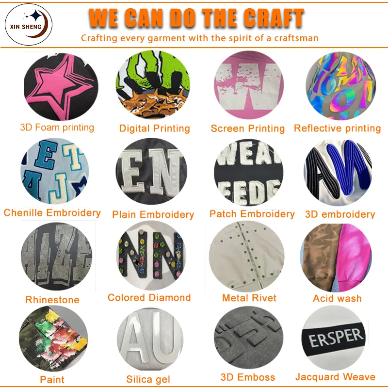 特筆すべき点は、 採取方針 顧客は最初にサンプル代を支払いますが、大量注文が1色あたり1型200個以上の場合、その料金は返金されます。 大量注文のデポジット支払い後は、無料でサンプルを提供します。 当社は、3Dフォームプリント、デジタルプリント、スクリーンプリント、リフレクティブプリント、各種刺繍(チネラ、プレーン、パッチ、3D)、ラインストーン加工、カラーダイアモンドインレー、メタルリベット、酸洗い、ペイント、シリカゲル、3Dエンボス、ジャカード織など、多岐にわたる加工技術を備えており、衣類のディテールにおいて多様なカスタマイズが可能です。